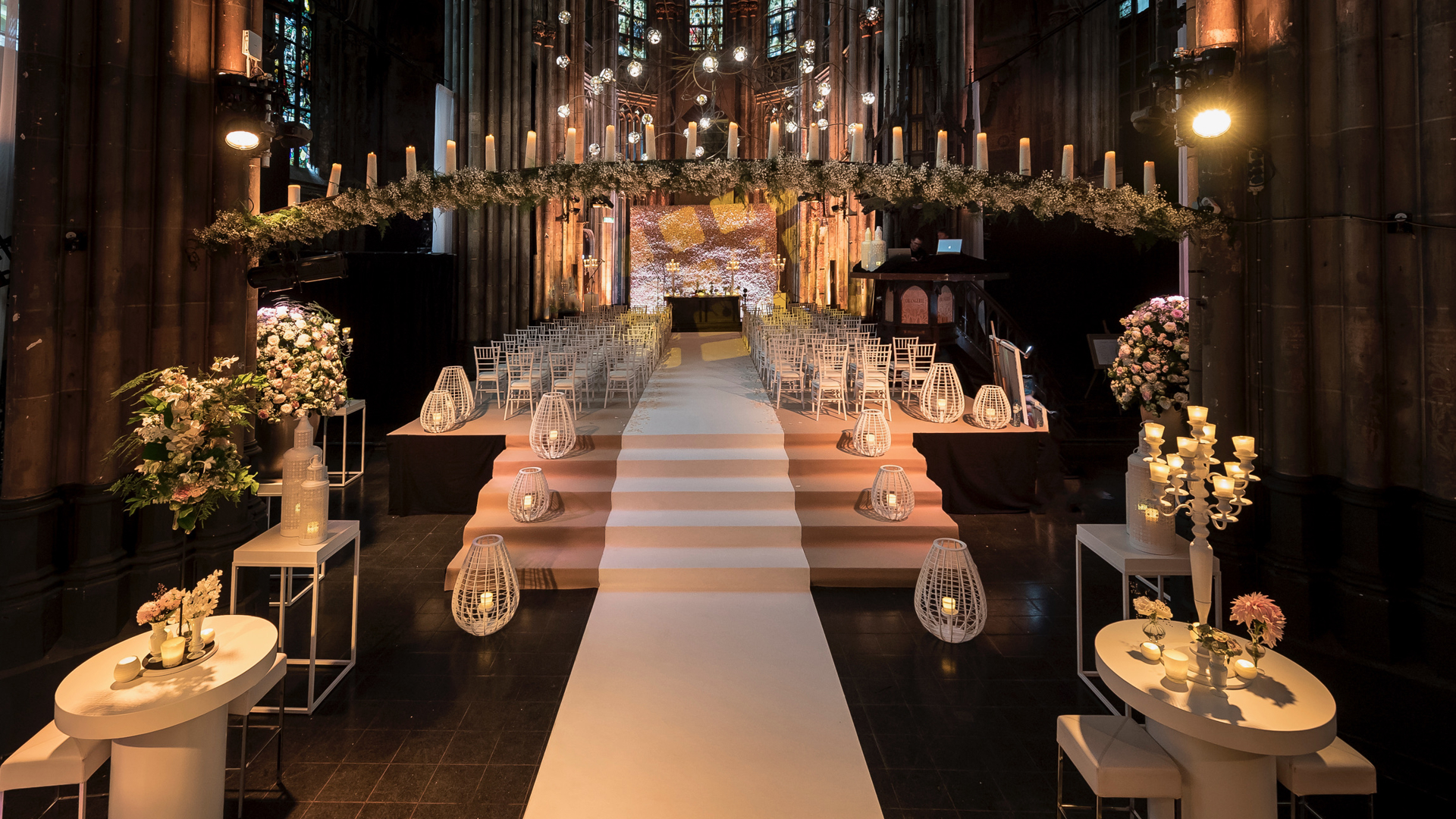 De Orangerie in Den Bosch is een plek die in één dag in meerdere werelden kan veranderen; zo bleek tijdens het zomerhuwelijk van Rick Karsdorp en Astrid. Van een altaar met een acht meter lange bloemenwand tot een romantisch kaarsverlicht diner, en afsluitend een stralend feest. De authentieke kerk in Den Bosch bouwden we voor elk speciaal moment op de dag om tot een heel eigen sprookjeswereld. Elk nieuw decor was een wonderlijke verrassing voor de gasten. Deze historische plek is het perfecte samenspel van modern en klassiek, met zijn subtiele muurschilderingen en kleurrijke glas in lood ramen.
